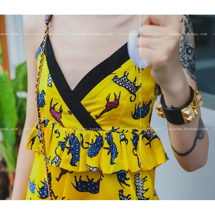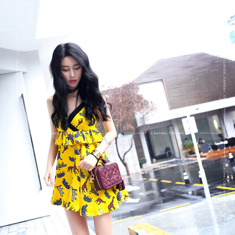 TE5257QBY Fashion vintage slim shivering print backless gallus dress
